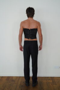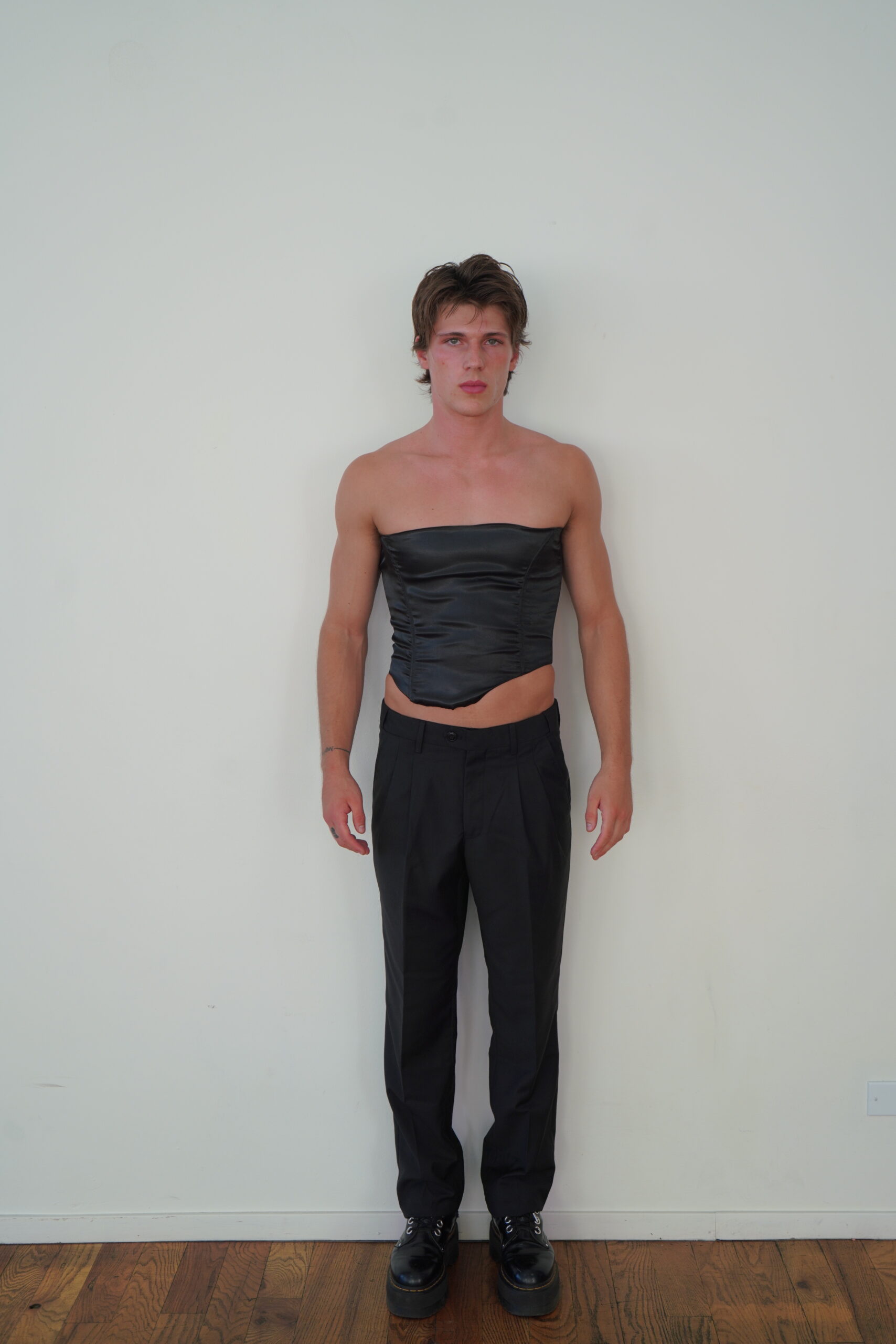 Cut in lustrous silk satin with a clean, compact line. Panel construction defines the waist; an asymmetric front hem adds movement. The lace-up back allows a precise, secure fit.