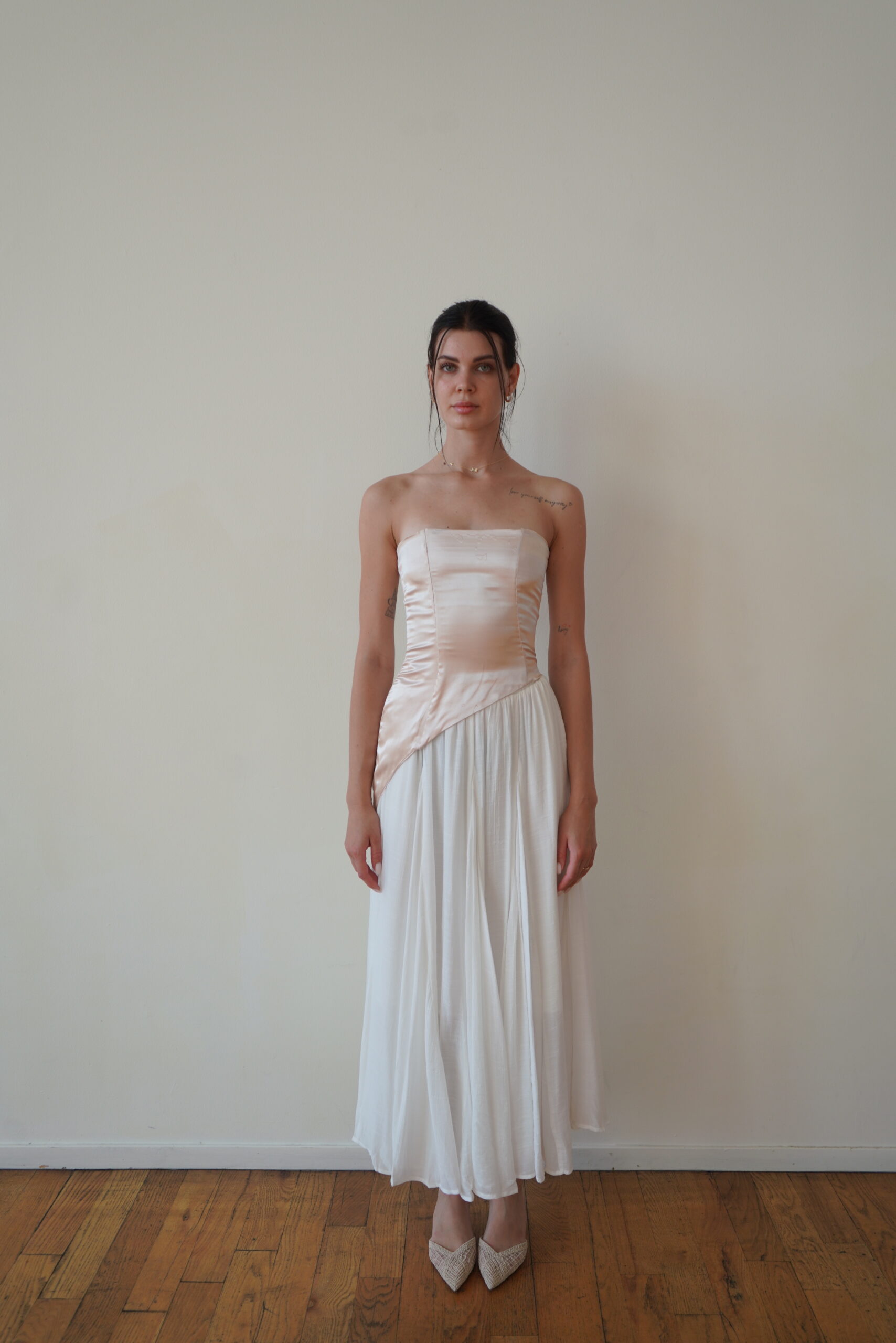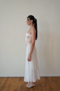 Cut in luminous satin with clean lines. Panel construction shapes the torso; a lace-up back allows a precise fit. An asymmetric drape at the waist softens the silhouette.